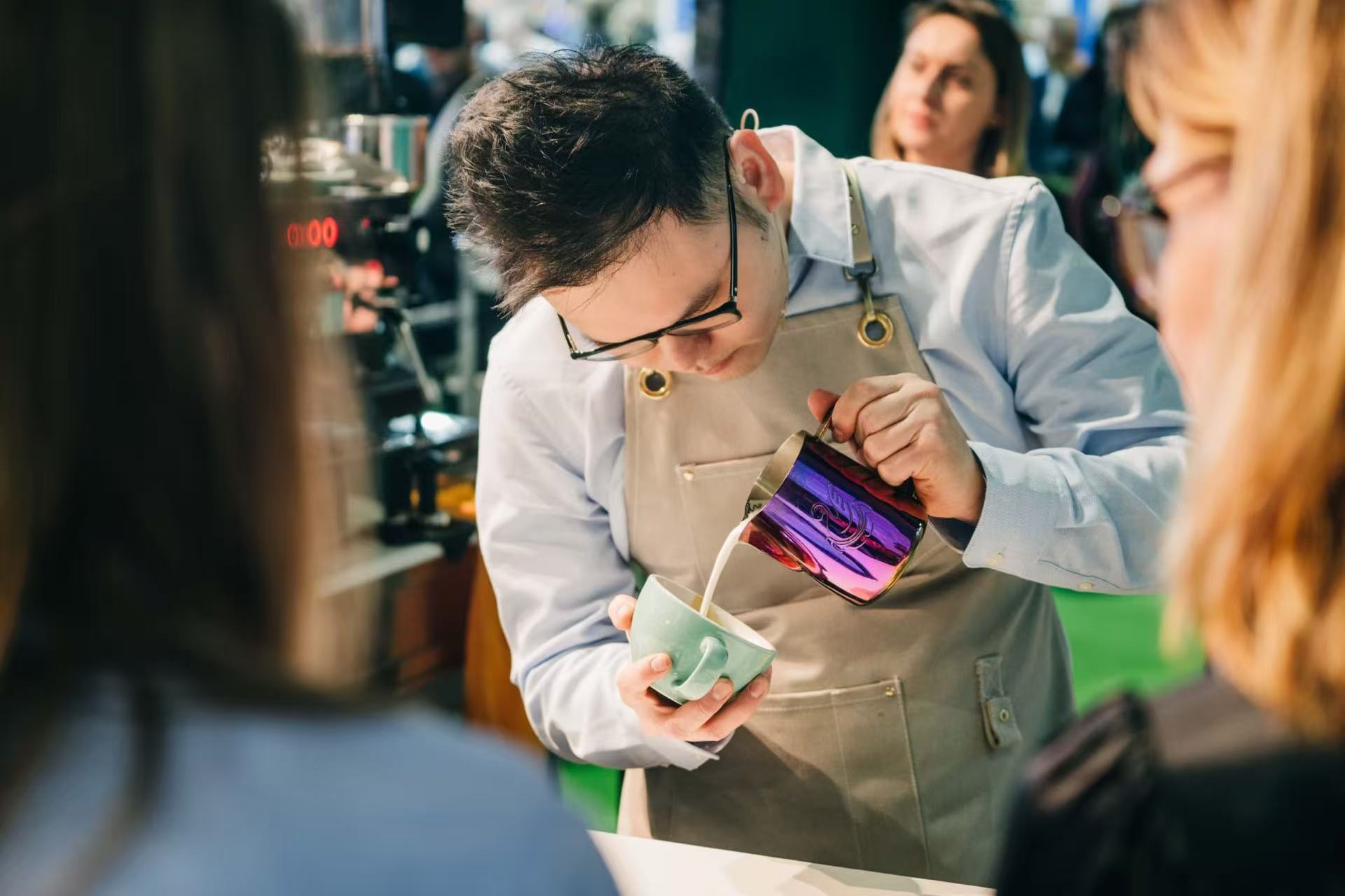 Intermediate baristas refining technique.